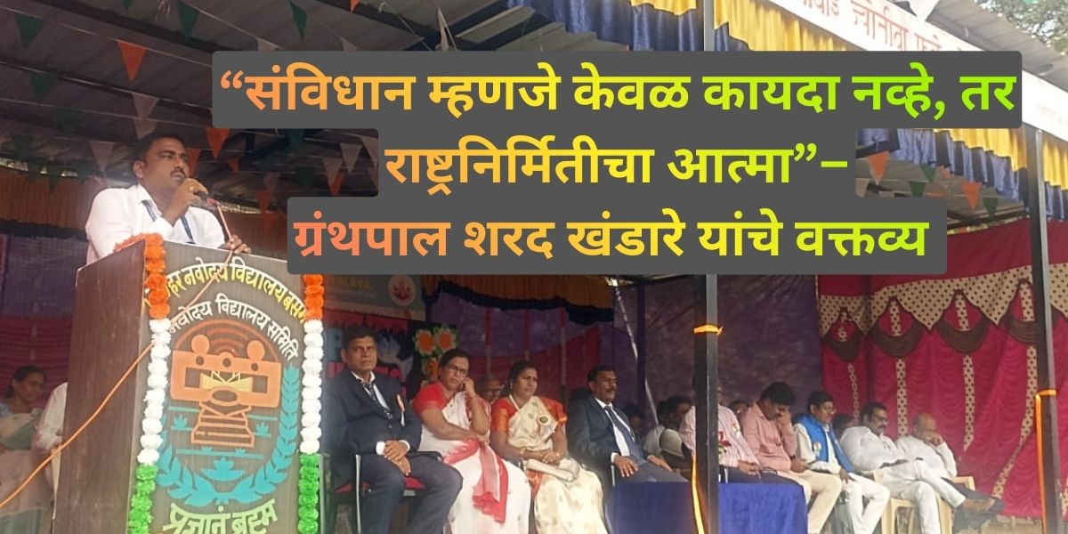 JNV Hingoli विद्यालयाचे ग्रंथपाल श्री. शरद खंडारे यांनी आपल्या भाषणात सबंध विद्यार्थ्यांना व उपस्थितांना भारतीय संविधानाचे महत्त्व अत्यंत प्रभावीपणे समजावून सांगितले. त्यांनी सांगितले की, भारतीय संविधान हे केवळ कायद्यांचे पुस्तक नसून, समानता, स्वातंत्र्य, न्याय व बंधुता या मूल्यांवर आधारित राष्ट्रनिर्मितीचा पाया आहे जो डॉ बाबासाहेब अंबेडकर यांच्या अथक परिश्रमातुन साध्य झाला.