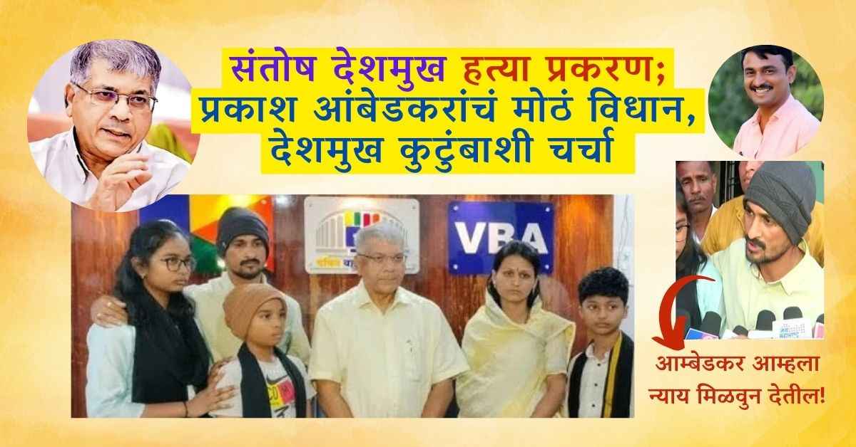 संतोष देशमुख हत्या प्रकरणामध्ये आता एक नवा ट्विस्ट आला आहे. या प्रकरणावर प्रकाश आंबेडकरांनी केलेल्या तार्कीक विधानामुळे राजकीय वर्तुळात चर्चा रंगली आहे. देशमुख कुटुंबाने नुकतीच प्रकाश आंबेडकरांची भेट घेतली, ज्यामध्ये त्यांनी न्यायाची मागणी केलेली आहे; प्रकाश अम्बेडकरानी त्याना आपण त्यांच्या पाठीशी आहोत असे अस्वासन दिले.